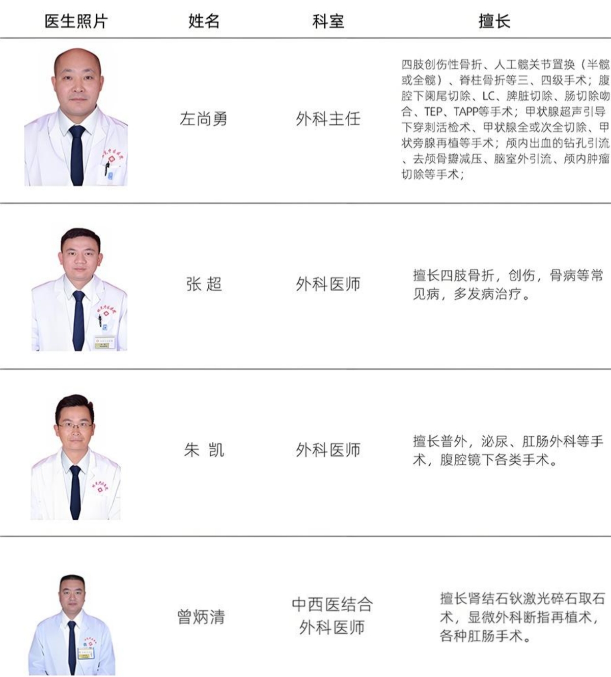 我院外科開展范圍有:骨科、關(guān)節(jié)鏡檢查與治療、顯微外科、普通外科、創(chuàng)傷外科等。